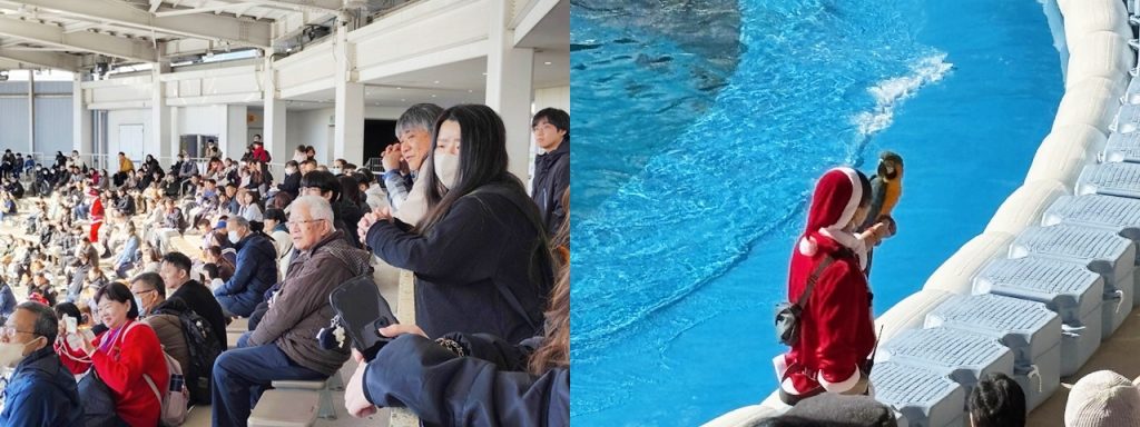 12月ということもあり、トレーナーの方がサンタさんの服を着ていたり、イルカとアシカでジングルベルを演奏したりなど、クリスマスバージョンでした(ღ✪v✪)。o○🎄